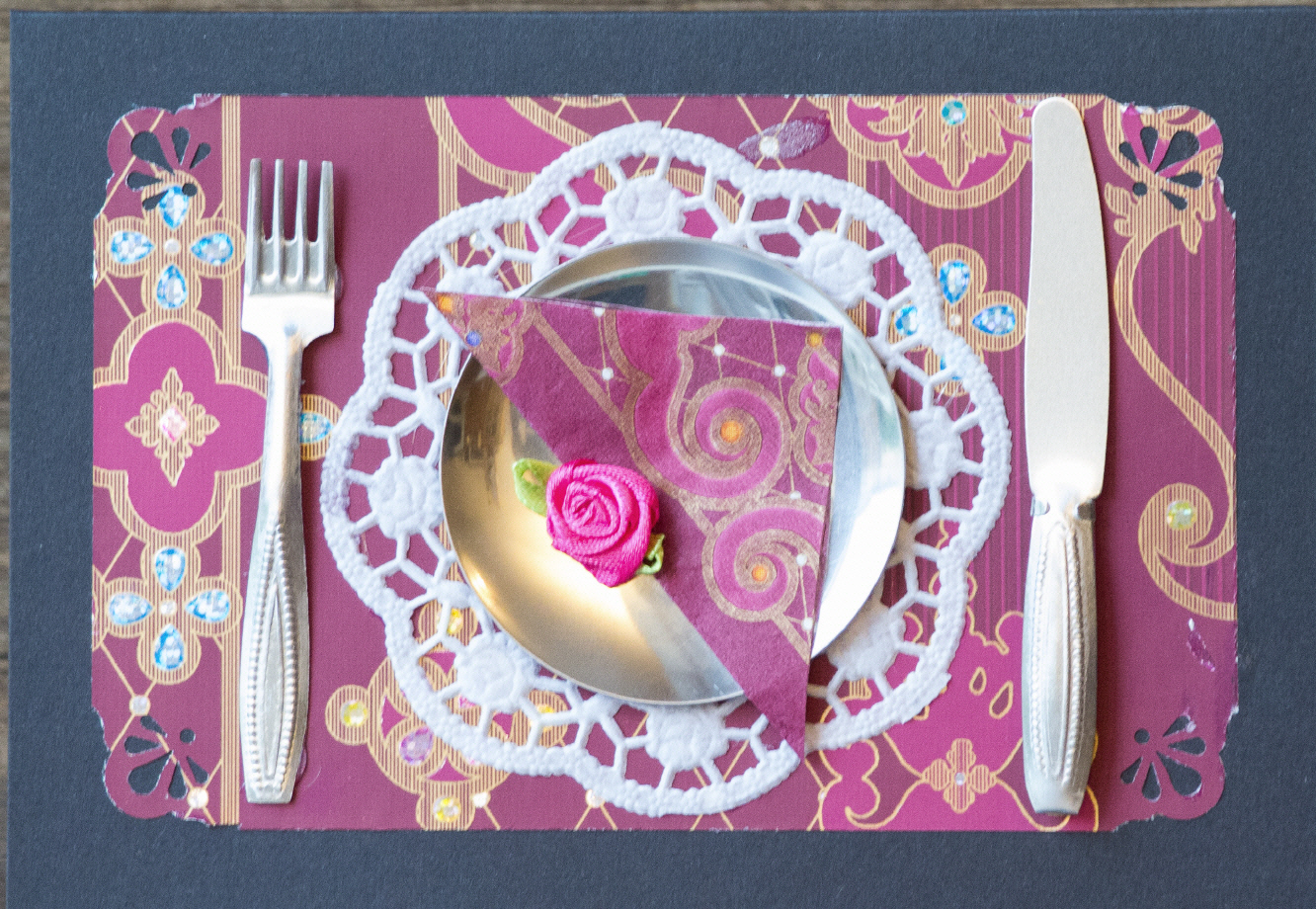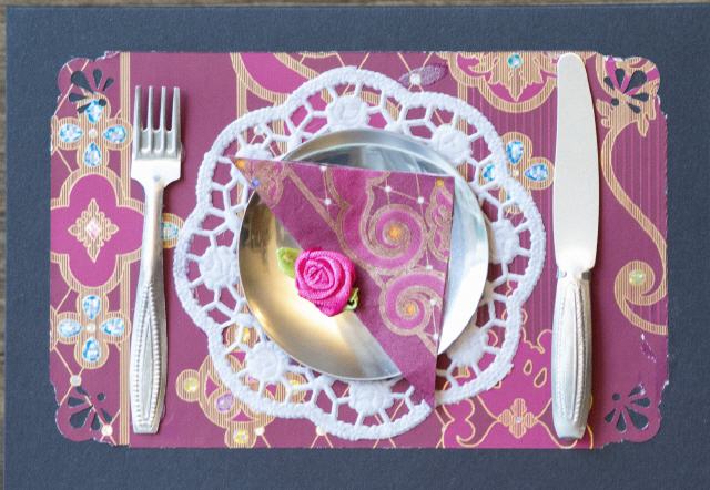 Sie sind hier: Startseite » Grußkarten mit Geldkuvert » Essen & Trinken » Gedeckter Tisch Gedeckter Tisch Karte »Dinner for two« | Format: B 6| Karte: Grundfarbe: Schwarz, »Tischdecke Ornamente«| aufstellbar| 3D-Effekt: aufgeklebter Messingteller und -besteck, Stoffröschen, Papierserviette|GeldkuvertPreis: 5 Euro (Auslaufmodell)