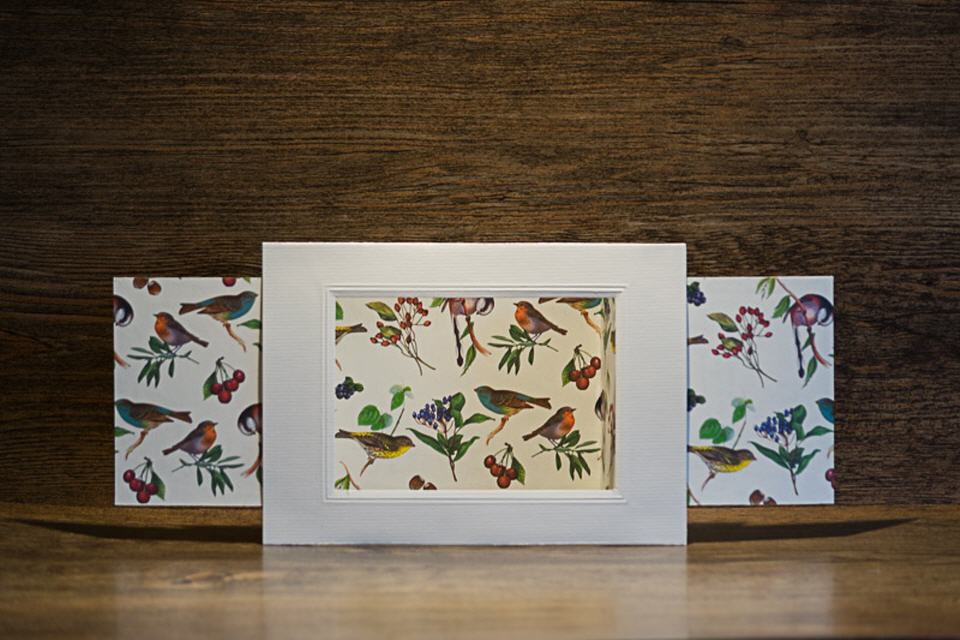 | Kulissenkarte mit Tiefenwirkung: Die Seitenteile der Karte werden aufgezogen, die Vogelkulisse wird sichtbar.
