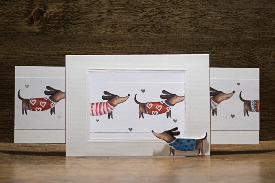 | Kulissenkarte mit Tiefenwirkung: Die Seitenteile der Karte werden aufgezogen, die Kulisse »Dackelglück« wird sichtbar.