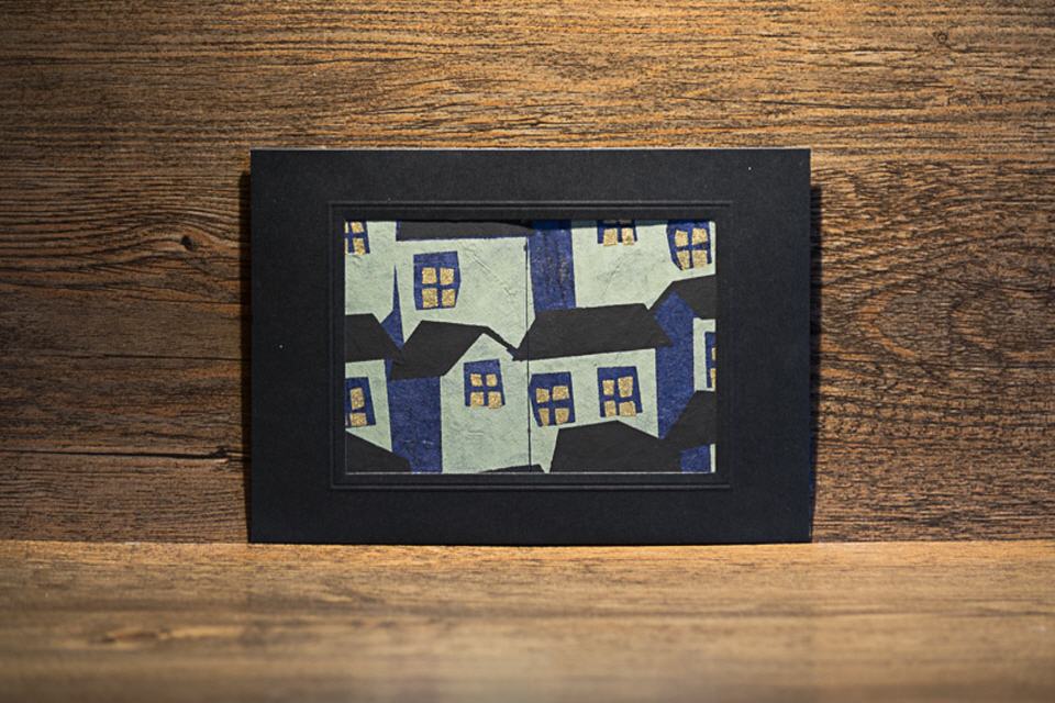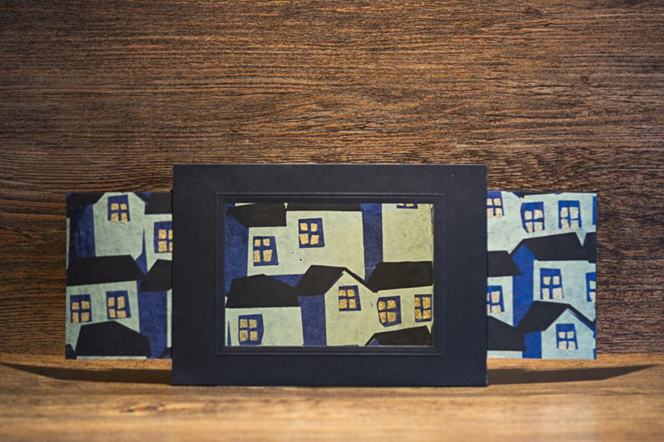 | Material der Häuser-Kulisse: handgeschöpftes Papier aus der Rinde des Seidelbaststrauches, hergestellt in Nepal