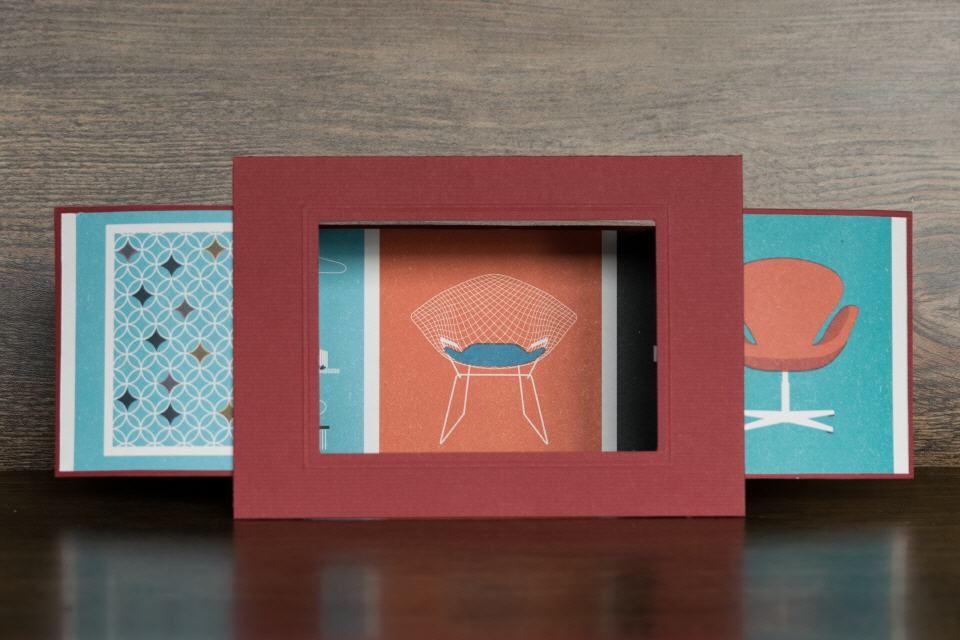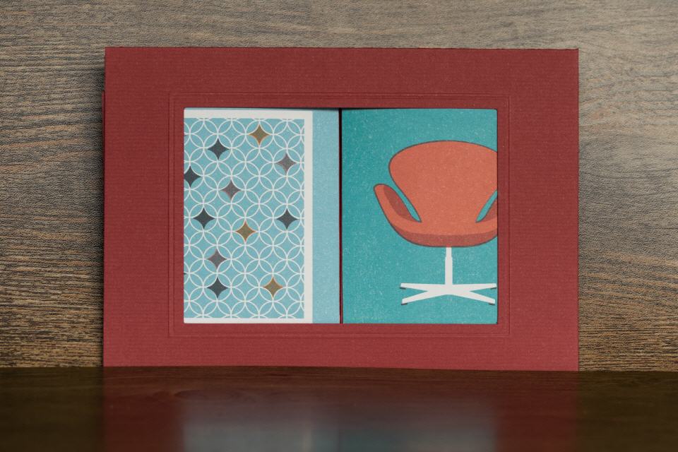 | Kulissenkarte mit Tiefenwirkung: Die Seitenteile der Karte werden aufgezogen, die Kulisse »Stay at home« wird sichtbar.