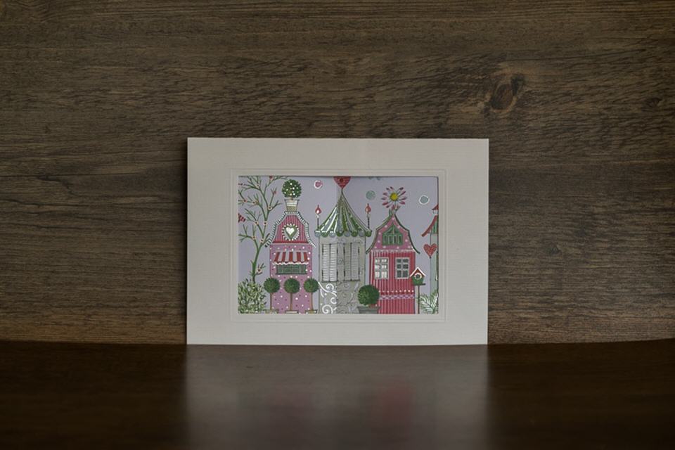 | Motivpapier weißes Papier mit rosa-grüne Reihenhäuschen und Bäumen; Folienprägung