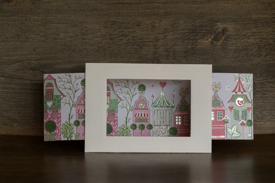 | Kulissenkarte mit Tiefenwirkung: Die Seitenteile der Karte werden aufgezogen, die Kulisse mit der Reihenhaussiedlung wird sichtbar.