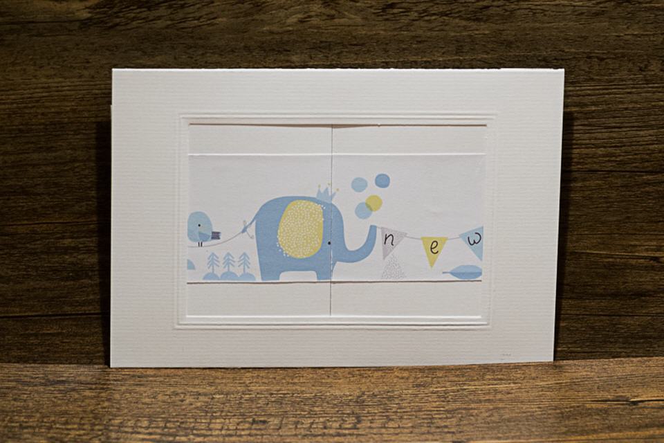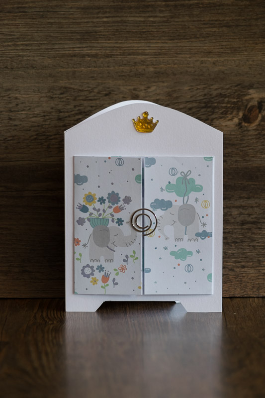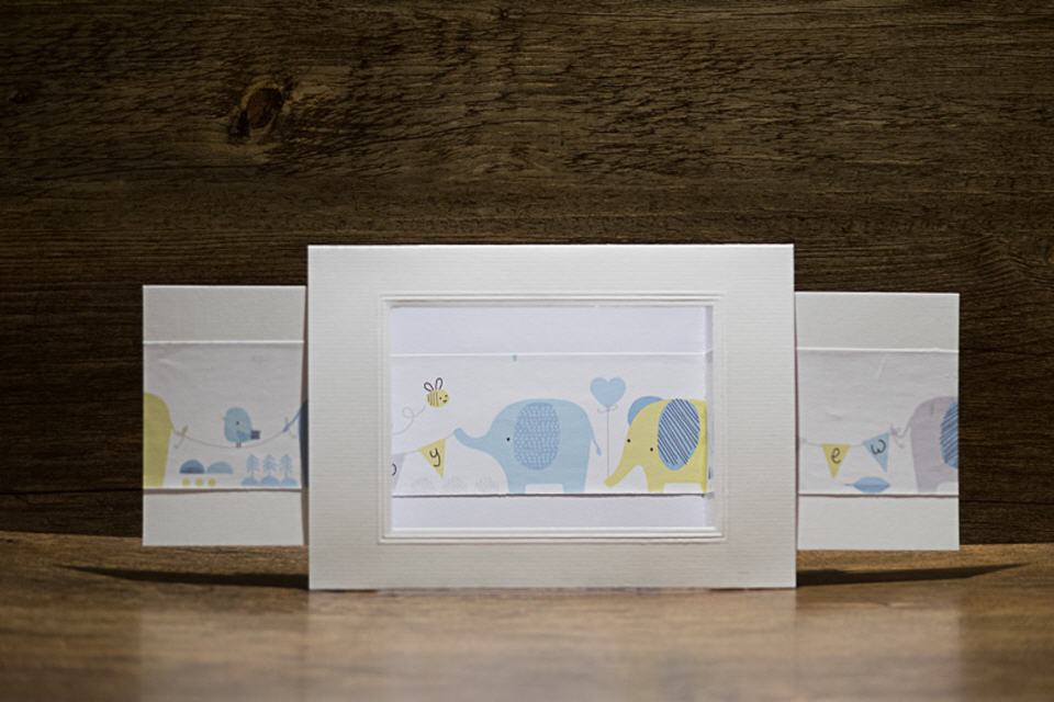| Kulissenkarte mit Tiefenwirkung: Die Seitenteile der Karte werden aufgezogen, die Kulissen mit den blauen Baby-Elefanten wird sichtbar.