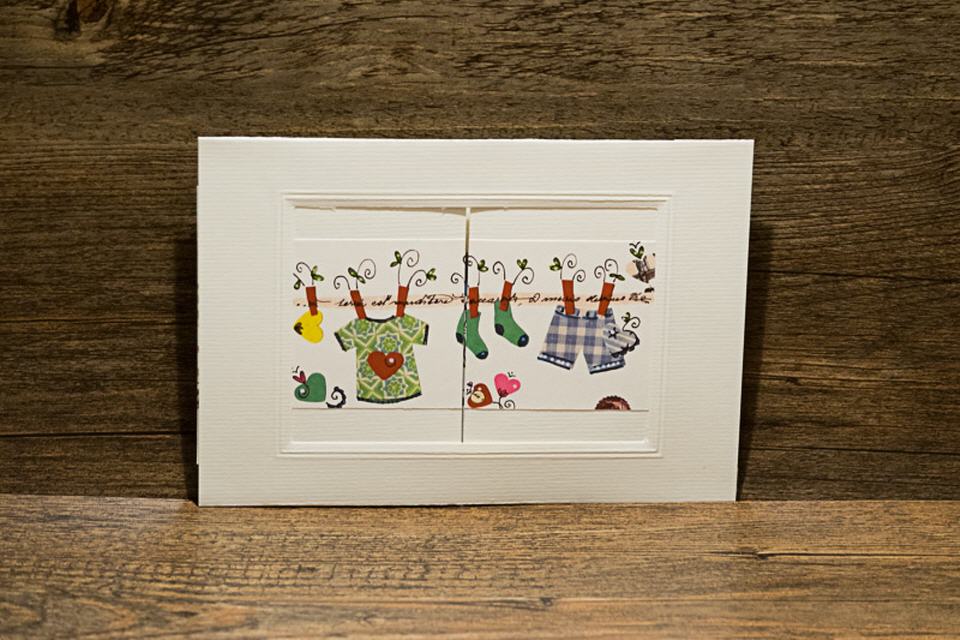 | Kulissenkarte mit Tiefenwirkung: Die Seitenteile der Karte werden aufgezogen, die Kulisse mit der Baby-Wäscheleine wird sichtbar.