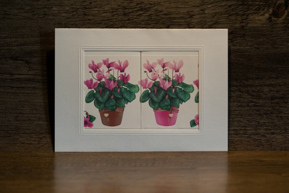 | Kulissenkarte mit Tiefenwirkung: Die Seitenteile der Karte werden aufgezogen, die Kulisse mit den Alpenveilchen wird sichtbar.