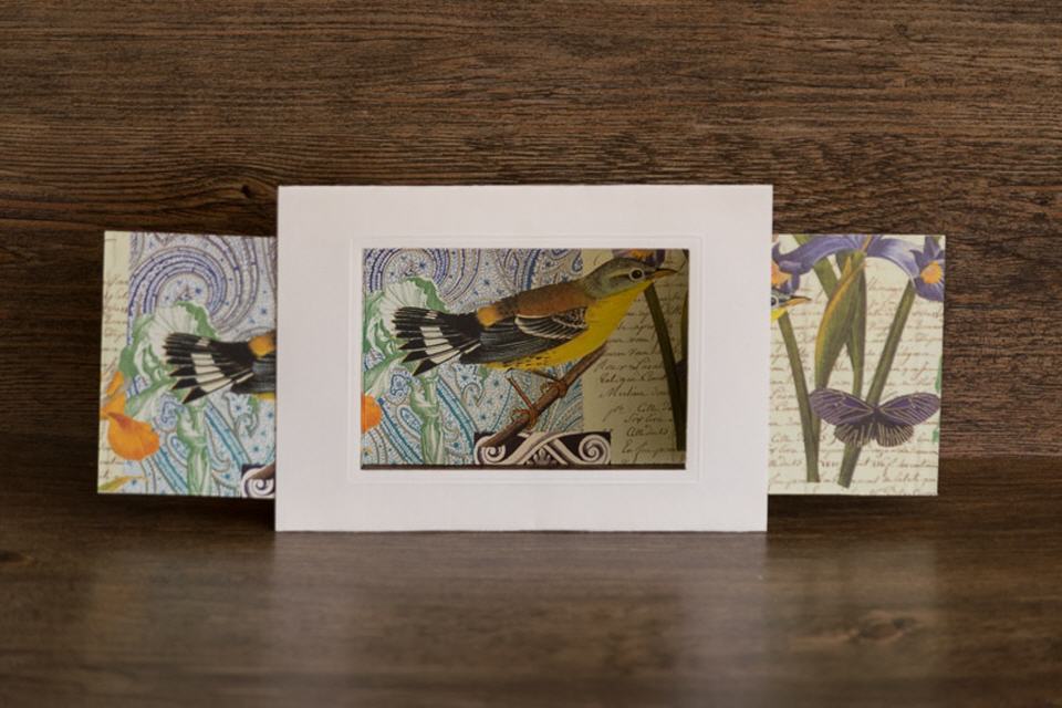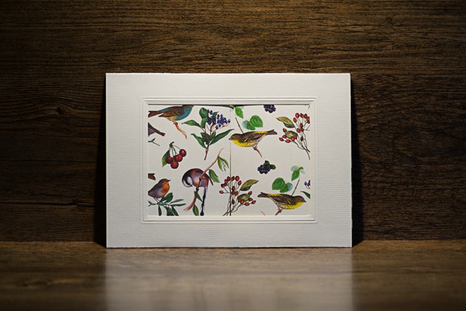 | Kulissenkarte mit Tiefenwirkung: Die Seitenteile der Karte werden aufgezogen, die Vogelkulisse wird sichtbar.