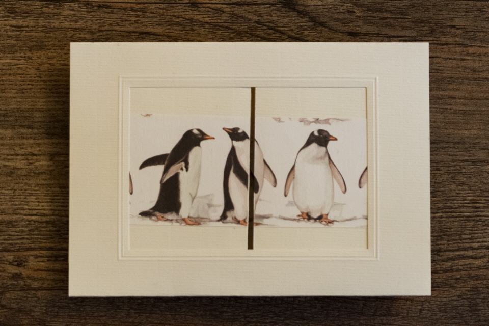 | Kulissenkarte mit Tiefenwirkung: Die Seitenteile der Karte werden aufgezogen, die Pinguinkulisse wird sichtbar.