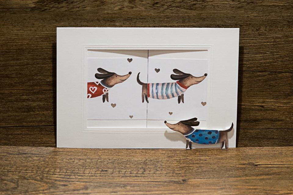 | Kulissenkarte mit Tiefenwirkung: Die Seitenteile der Karte werden aufgezogen, die Kulisse »Dackelglück« wird sichtbar.