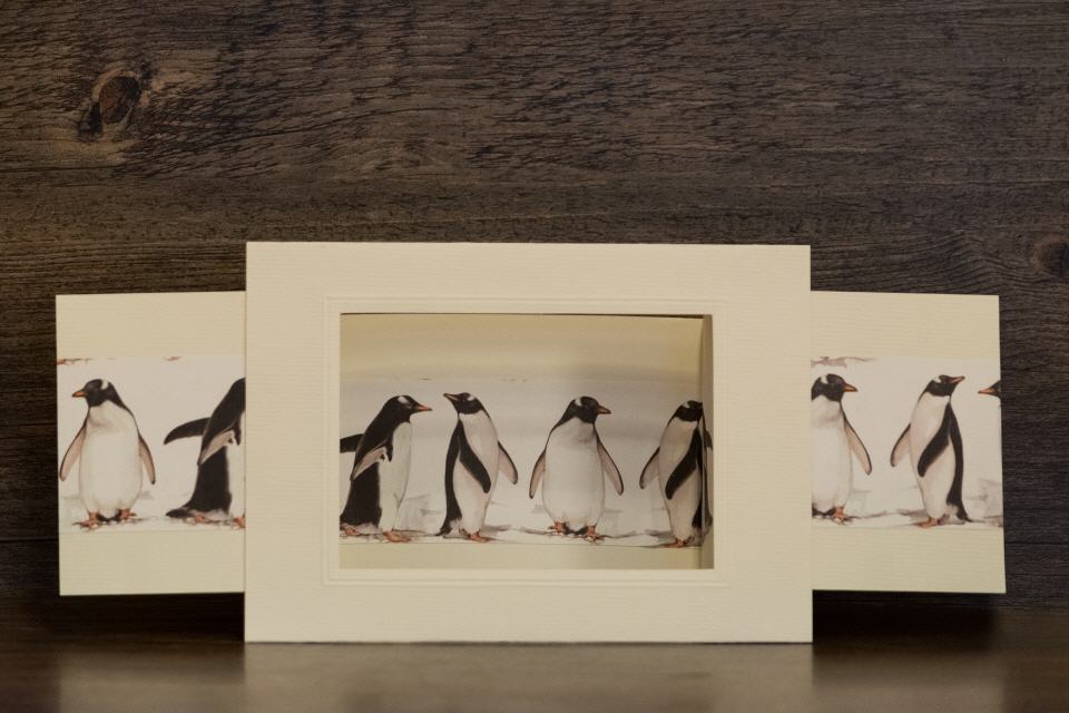 | Kulissenkarte mit Tiefenwirkung: Die Seitenteile der Karte werden aufgezogen, die Pinguin-Kulisse wird sichtbar.