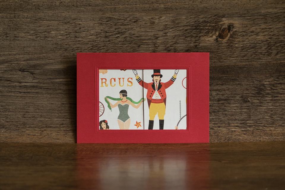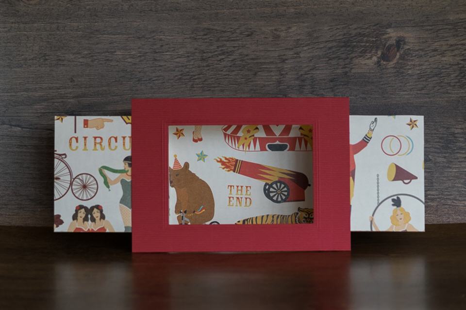 | Kulissenkarte mit Tiefenwirkung: Die Seitenteile der Karte werden aufgezogen, die Kulisse mit der Zirkusmanege wird sichtbar.