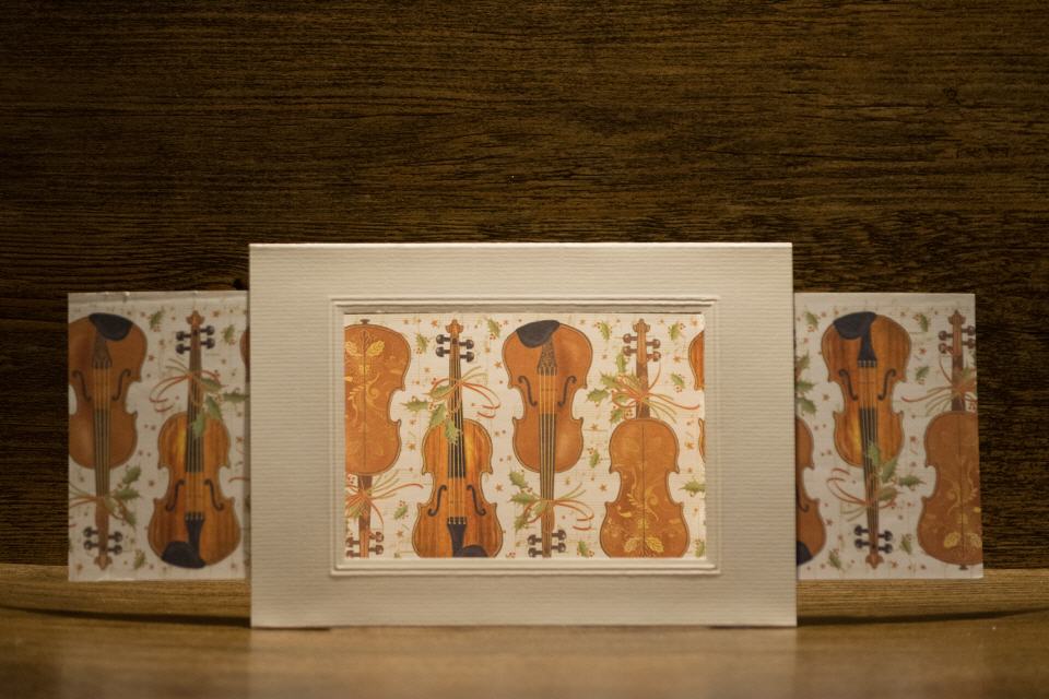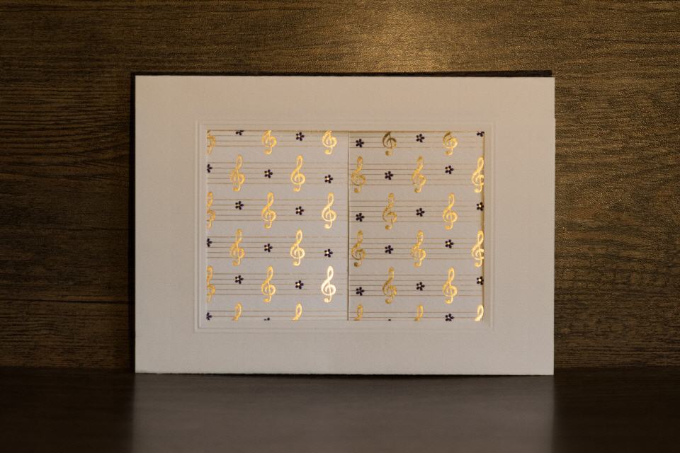| Kulissenkarte mit Tiefenwirkung: Die Seitenteile der Karte werden aufgezogen, die Kulisse »Himmel voller Geigen« wird sichtbar.
