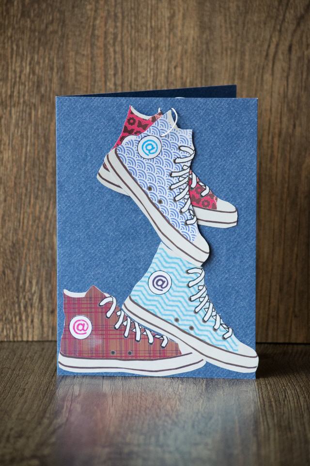 | Format: B 6 | Karte: Grundfarbe Jeansblau | aufstellbar | bunte, z.T. metallic-farbene einzeln ausgeschnittene Chucks | die oberen beiden (verstärkten) Schuhe baumeln lose an einem "Schnürsenkel" herunter | Geldkuvert