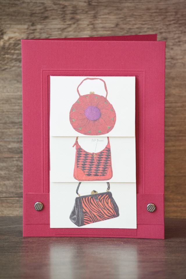 | Format: B 6 | Passpartout-Karte rechteckig: Grundfarbe Bordeaux | aufstellbar | Wasserfallmechanismus: Zieht man an der unteren Lasche, entfaltet sich nach und nach eine Bilderfolge von verschiedenen Taschenmodellen | Geldkuvert