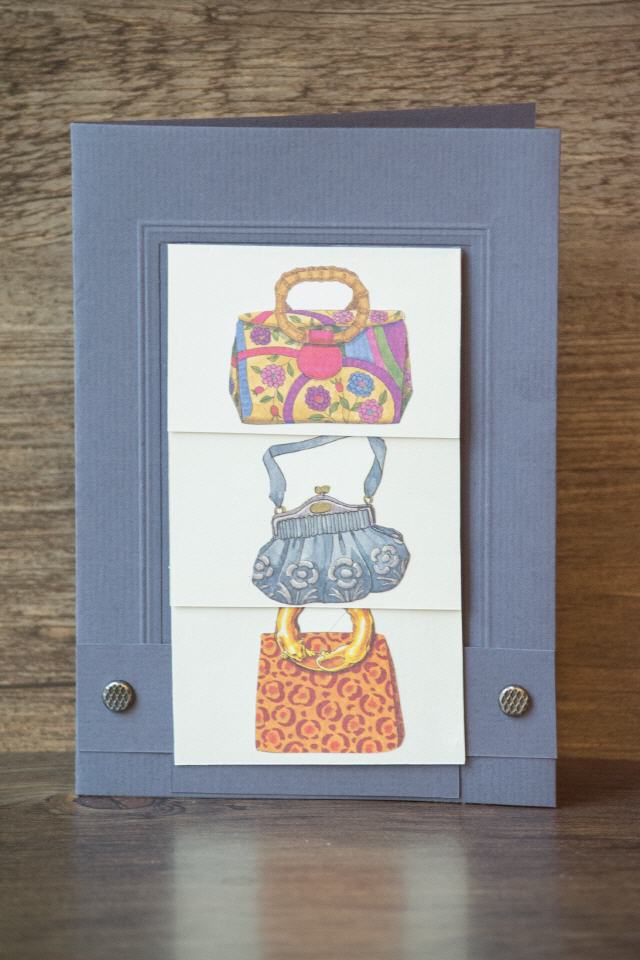 | Format: B 6 | Passpartout-Karte rechteckig: Grundfarbe Grau | aufstellbar | Wasserfallmechanismus: Zieht man an der unteren Lasche, entfaltet sich nach und nach eine Bilderfolge von verschiedenen Taschenmodellen | Geldkuvert